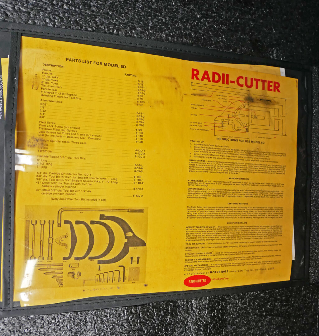 The 8D Radii-Cutter is capable of cutting almost any spherical contour you would ever require. Typical applications include complete balls, sockets, ball bearing races, pipe bending dies, tube rolling die sets, concave and convex sections on parts and more. The only limit is your creativity