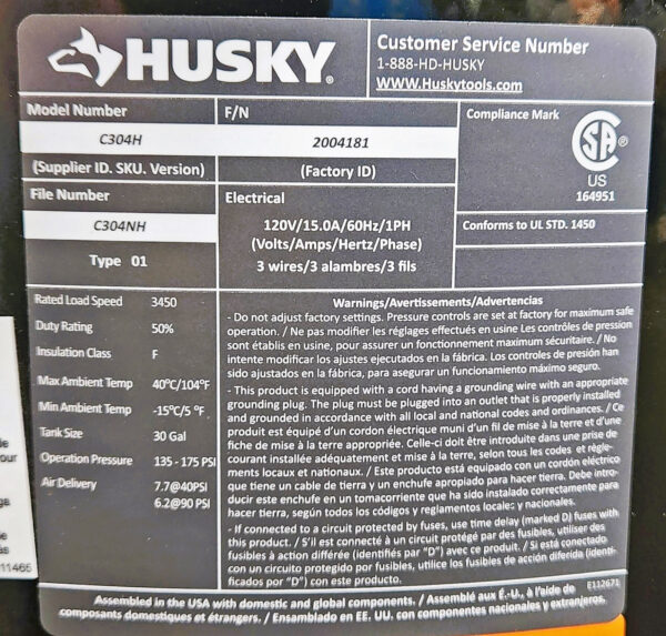 Husky 30 Gallon 175 PSI Portable Vertical Electric Air Compressor, C304H