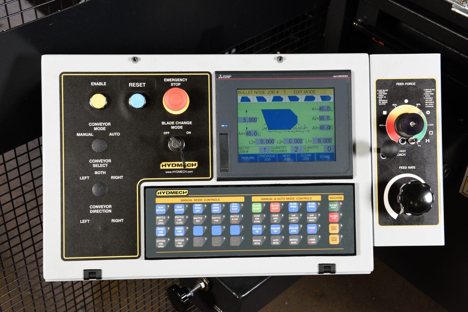 8.5″ Mitsubishi FX5U PLC color touch screen controller. No flipping from screen to screen, the control is interactive with messages for the operator, reducing the learning curve. User-friendly graphical icon programming from miter cutting, up to 1,000 jobs, 20 jobs in queue
