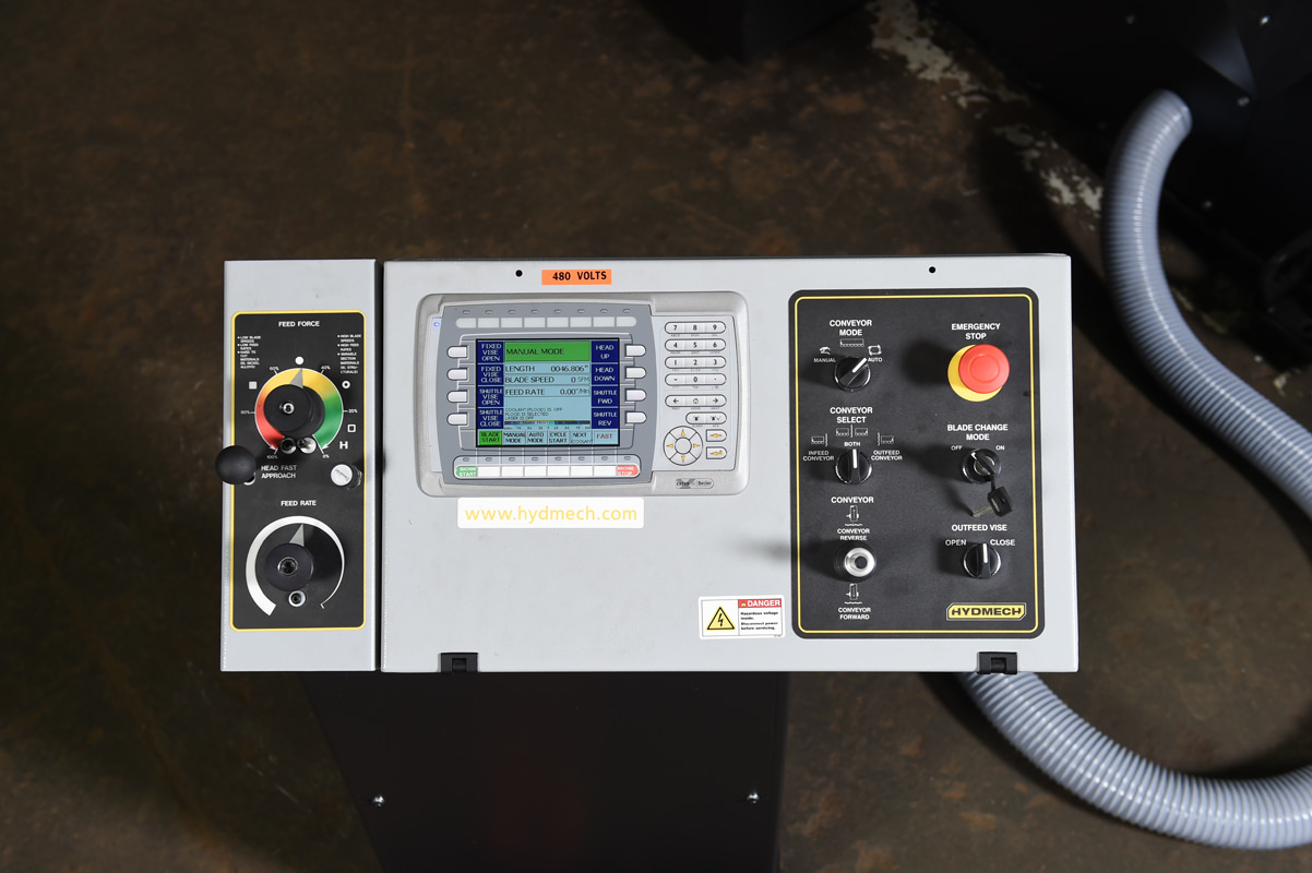 The H-28A-120 is fast, with its high-speed shuttle feed indexing up to 120″ in a single movement with weight capacities up to 15,000 lbs. A 5 HP driven hydraulic pump supplies system pressure through three-position directional valves controlling all vising, head up/down, blade tension, guide arm, and shuttle movement