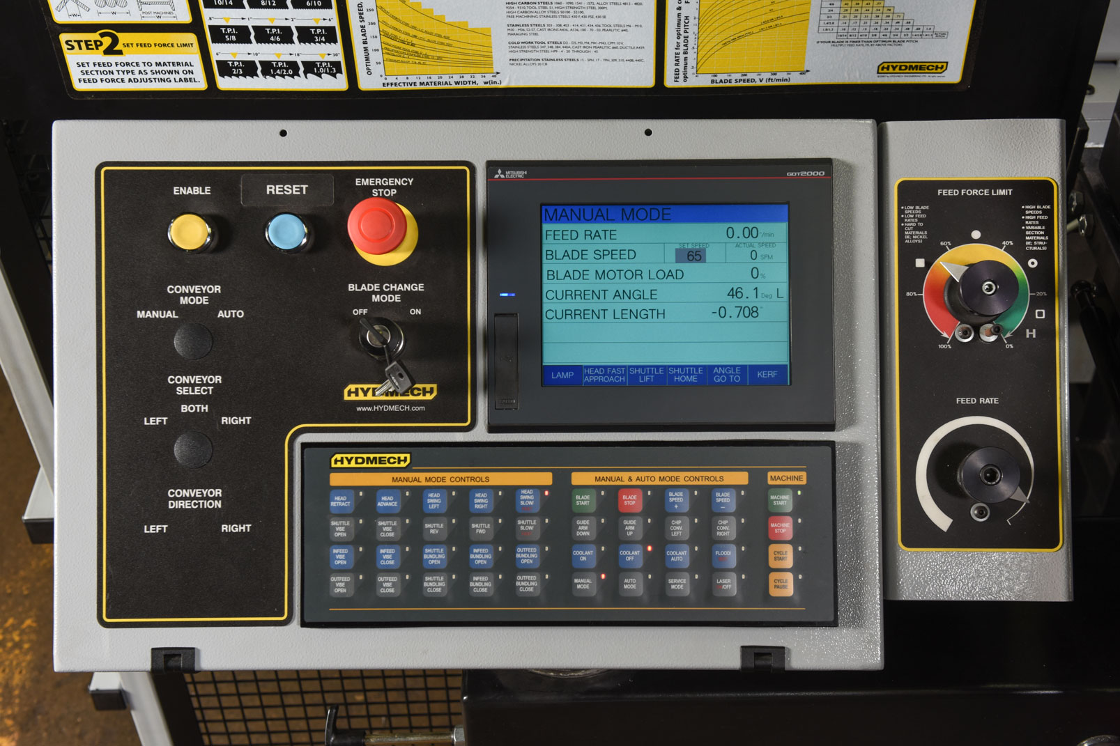 8.5″ Mitsubishi FX5U PLC color touch screen controller. No flipping from screen to screen, the control is interactive with messages for the operator, reducing the learning curve. User-friendly graphical icon programming for miter cutting, up to 1,000 jobs, 20 jobs in queue