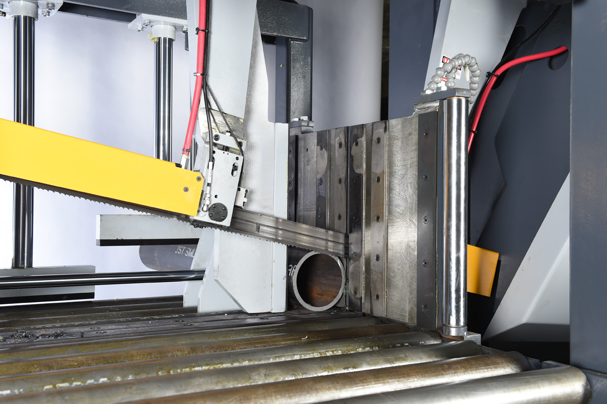 The H-26/44 is a semi-automatic horizontal band saw providing accurate 90° metal cutting for heavy-duty applications. Its 12° canted head allows for more efficient cutting and improved blade life. A 5 HP driven hydraulic pump supplies system pressure through three position directional valves controlling all vising, head up/down, blade tension, and guide arm