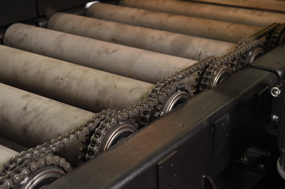 Cast iron guide arms. The idler side guide arm is mechanically connected to the front vise moveable jaw for proper guide arm spacing at all times