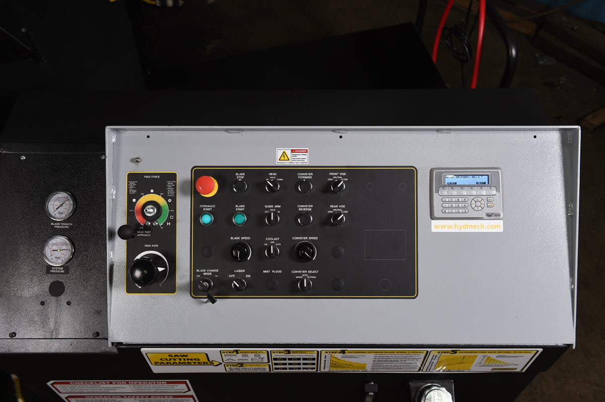 The H-40/40 has a workload capacity of 50,000 lbs. A 5 HP driven hydraulic pump supplies system pressure through three position directional valves controlled all vising, head up/down, blade tension, guide arm, and shuttle movement
